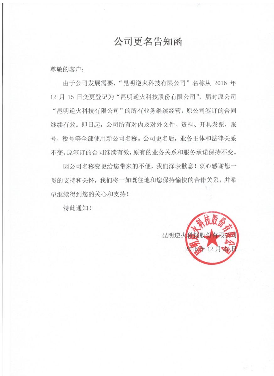 昆明逆火科技有限公司更名告知函