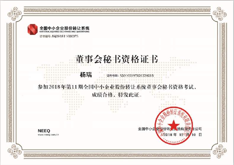 昆明逆火科技股份有限公司董事楊瑞先生,參加了2018年第11期全國(guó)中小企業(yè)股份轉(zhuǎn)讓系統(tǒng)董事會(huì)秘書(shū)資格考試,獲得“董事會(huì)秘書(shū)資格證書(shū)”!